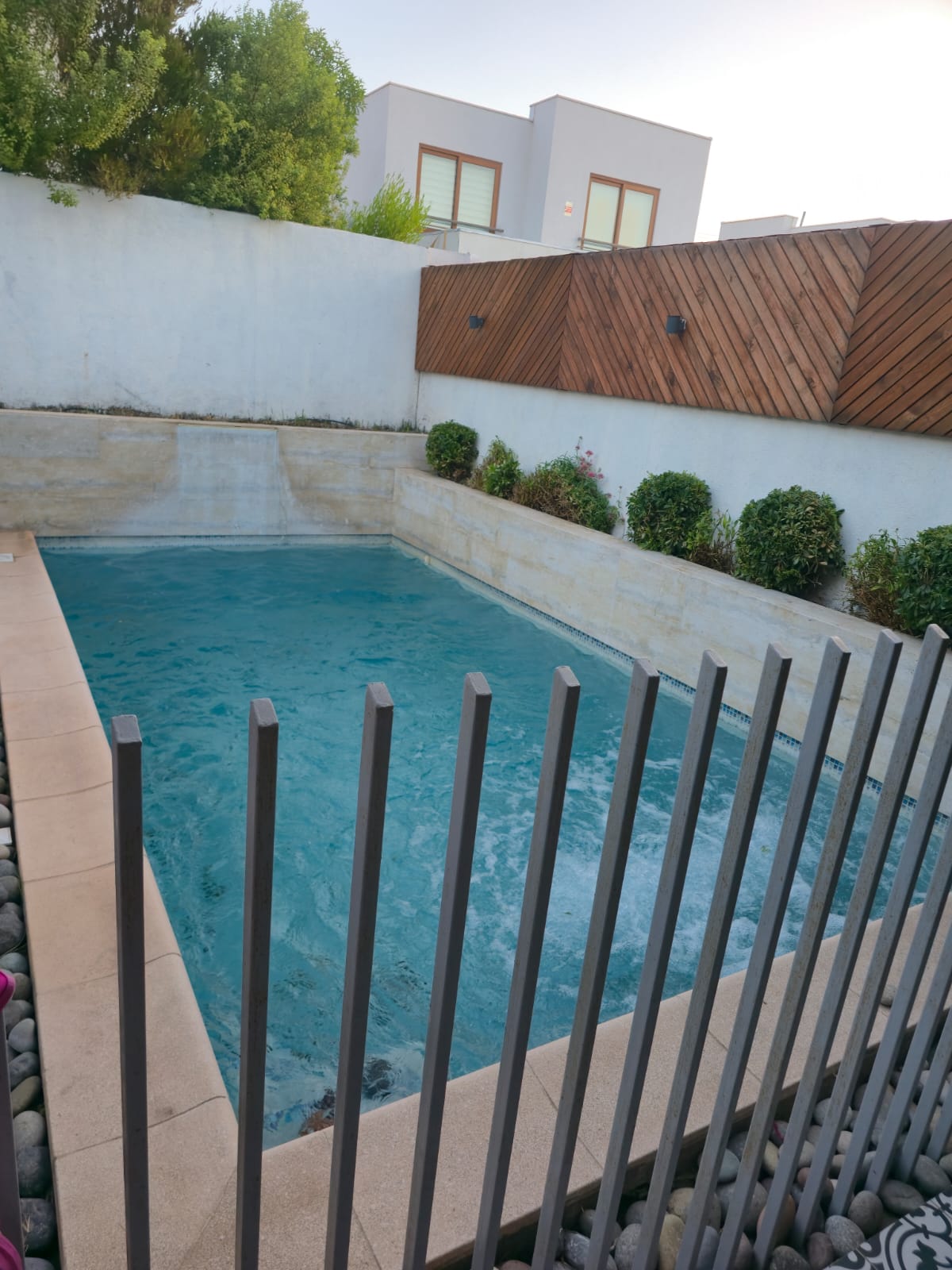 Piscina de hormigón con iluminación y cascada